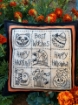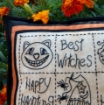 Nine familiar Halloween motifs in a checkerboard setting create a Happy Halloween Pillow to decorate your home for ALL the creepy and scary holiday parties you will have! Lots of Tricks & Treating for a hauntingly good time. Embroidery on the rich Tea-dyed cotton with scattered dots looks terrific with the BlackWork Halloween Greetings and Halloween motifs.