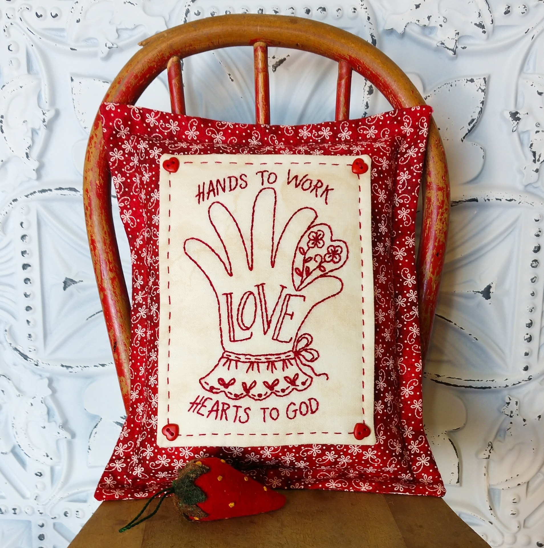 Hands to Work Pillow = 8 1/2" x 10 1/2"; Embroidered Topper = 5" x 7"
