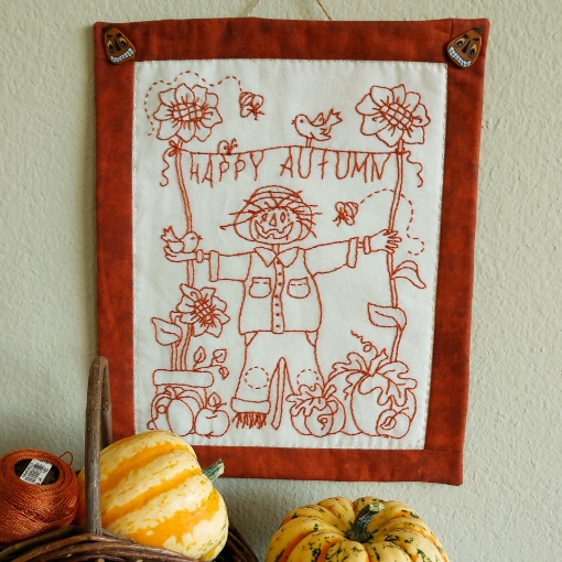 A jolly scarecrow Embroidered on Natural Muslin or Pashmina "Aged to Perfection" cotton with DMC #920 Medium Copper #8 Perle Cotton - something FUN to celebrate the season! Finish in a frame or "fabric frame" with seasonal prints.