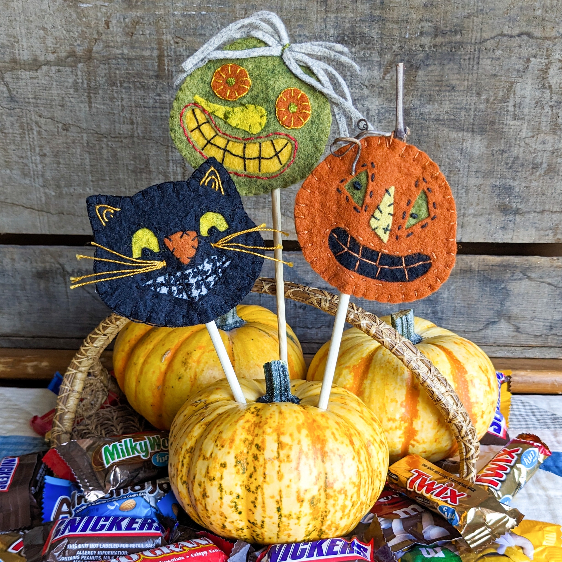 Three Halloween Characters to wear for the fall season. A scary black cat, a green witch with a wart on her nose (poor thing!) and a pumpkin with a big smile. Easy to make and fun to wear or give as gifts.