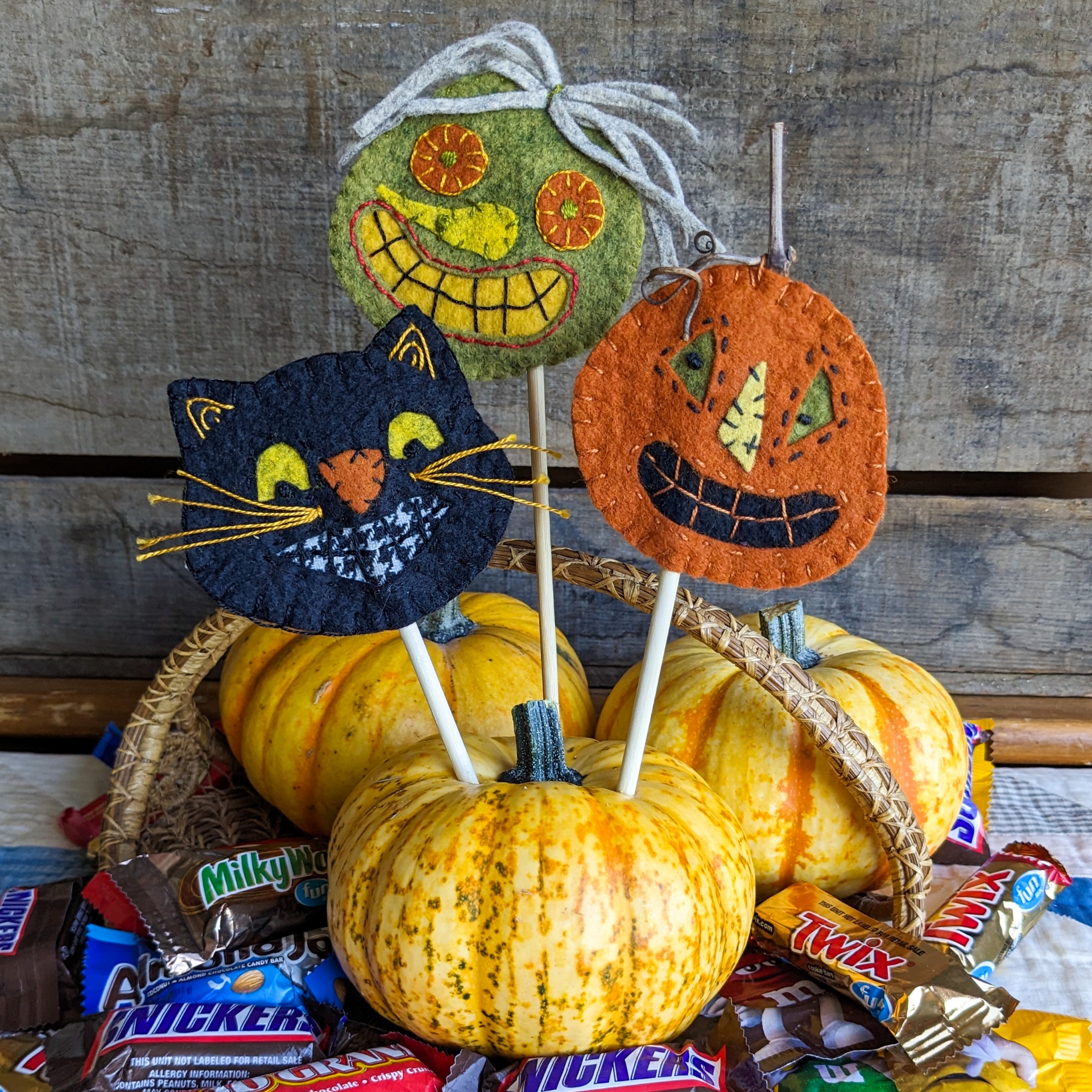 Three Halloween Characters to wear for the fall season. A scary black cat, a green witch with a wart on her nose (poor thing!) and a pumpkin with a big smile. Easy to make and fun to wear or give as gifts.