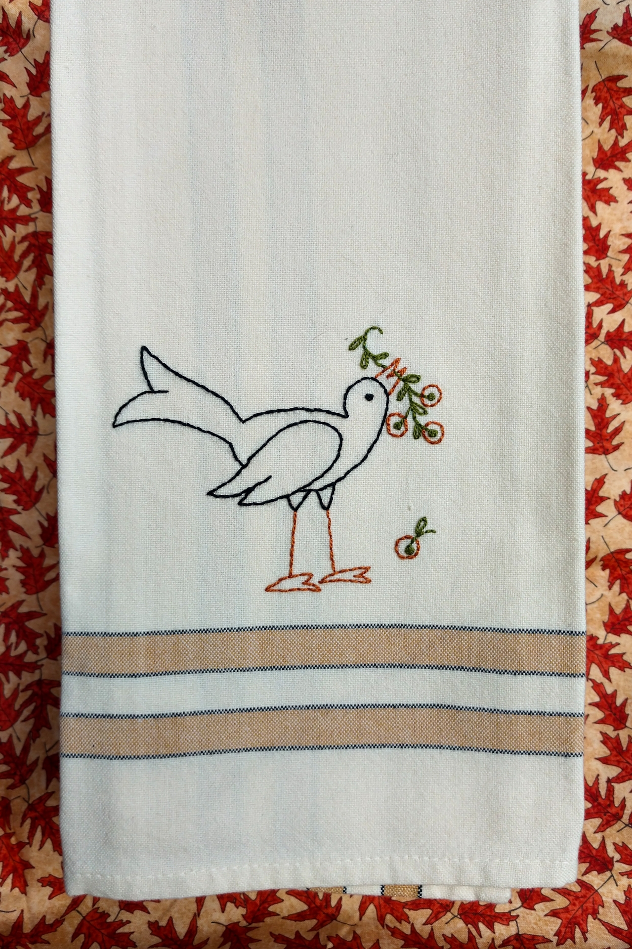 A Crow from our Harvest Tea Towels patterns on a Gold Tea Towel.Embroidery Size: 4.5" x 3.5"Gold Tea Towel: 20" x 28"