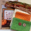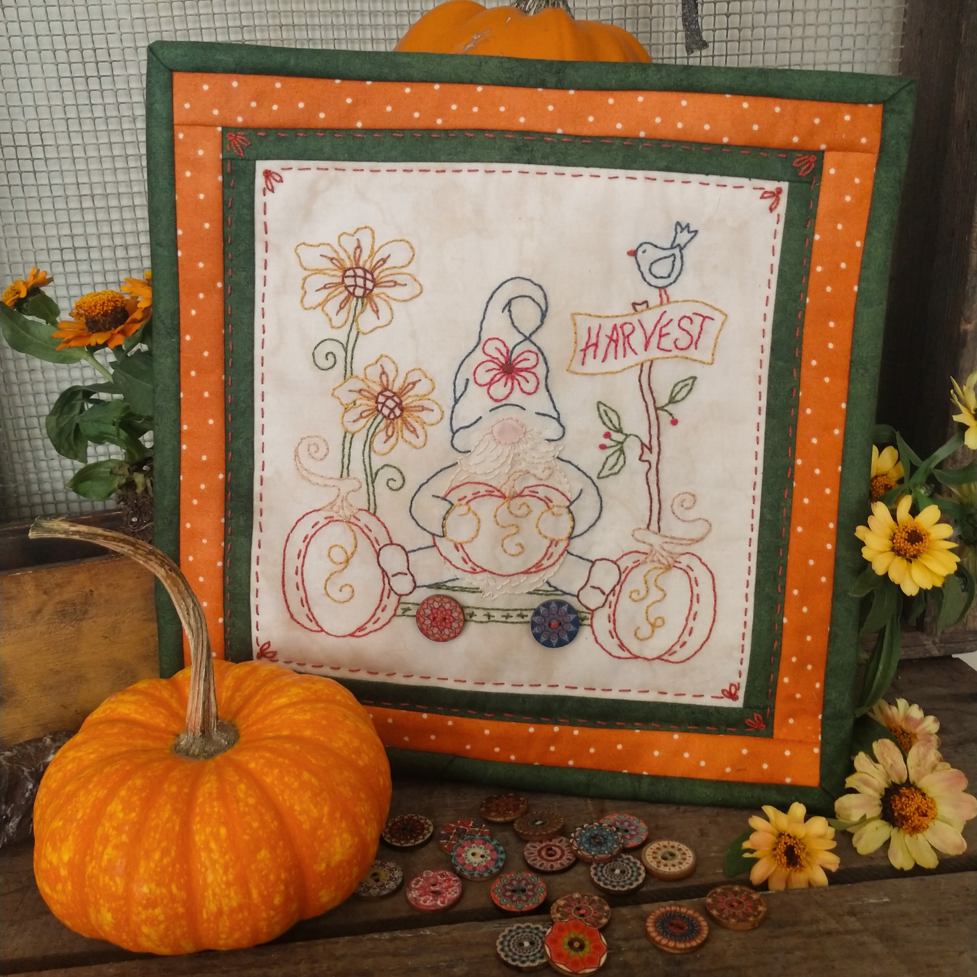 A Quick-to-Stitch little Gnome on his wagon with the Wooden Button wheels to enjoy Autumn with fat pumpkins and pretty sunflowers to celebrate the season! Add a little blush make-up for his peachy-pink nose and stitch the wagon wheels or use the Buttons.