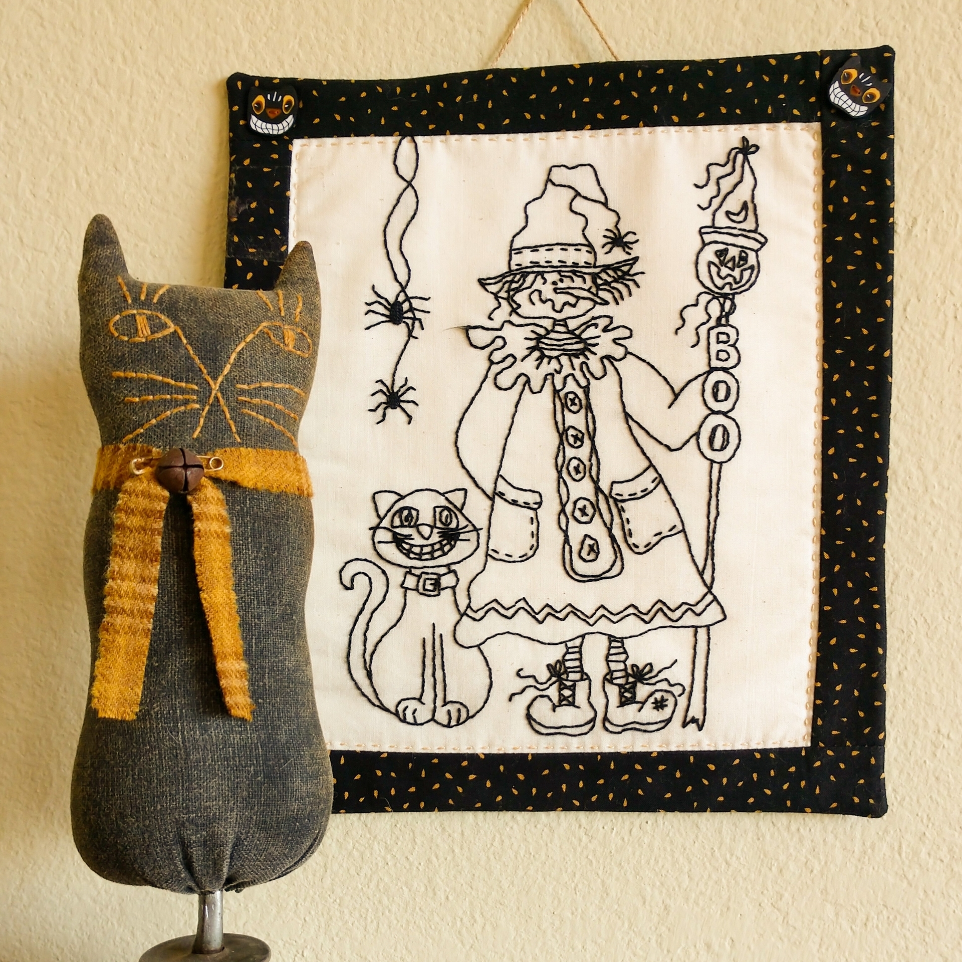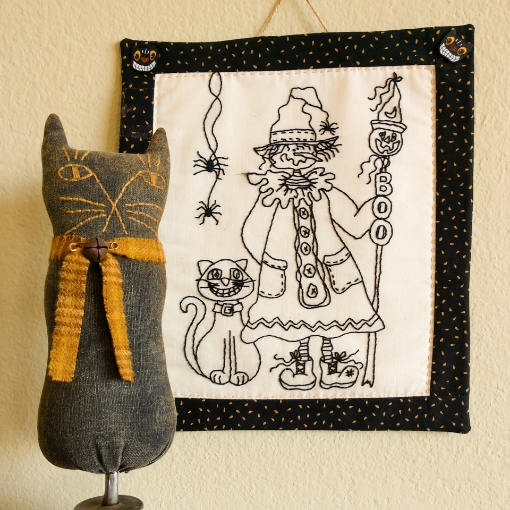 A "lovely" Embroidered pair of friends ready to celebrate Halloween with you! Stitch-up Miss Witch and her faithful Pals to decorate your home or office. Stitch on muslin in scary black Pearl cotton and frame or add a quilted fabric border.Trace your friends directly onto the Heavy Weight Muslin or tonal Pashmina "Aged to Perfection" Cotton with a heat removeable FriXion Pen.If you DO NOT like to trace, use Stick 'n Stitch. Print the design on the Stick 'n Stitch. Pull the film off the paper backing and finger press onto your muslin. Add your hoop and get stitching in minutes - super stuff!Stitched with Presencia Black #0007.Finished Size:Embroidery = 8" x 10" Wall Hanging = 9 1/2" x 12"