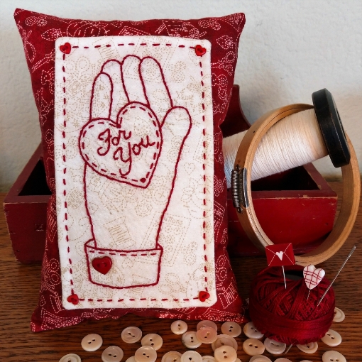The Embroidered Top Patch is appliqued with tiny Red Heart “Buttons” on to a bright and cheerful stuffed Pin Cushion.Add another Red Heart Button to the cuff.