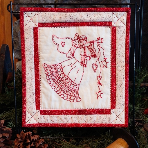 Embroider in cheerful RedWork with Presencia Robin Red choosing #8 on Natural Muslin or tonal “Feather Down” cotton and sashing in a pair of pretty Red and Cream prints.