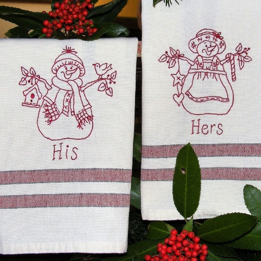 Embroider a tea towel with His and Hers Snow People that is fun, quick and easy for you to get ready for the holidays. Make a towel for the "man of the house" so he can feel special as he helps with the holiday dinner dishes! The Redwork Embroidery on our Dunroven House Red tea towel is quick to stitch. It will take just an afternoon or an evening to finish each towel. Relax near the Christmas tree and enjoy some time stitching.To trace your design directly on your machine washed and dried tea towel use a Red Frixion Pen.