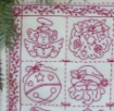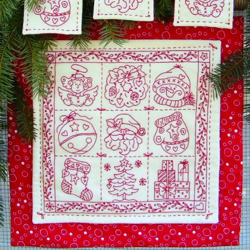A RedWork Embroidery in a Nine-Patch design. Make a Great Little Wall Hanging or Create the Design in a Fun Pillow for Holiday Decorating. Each of the little Patches Make Nice QUICK-TO-MAKE Ornaments to Hang on Your Tree. Make a Batch of Ornaments for Gifts This Year.