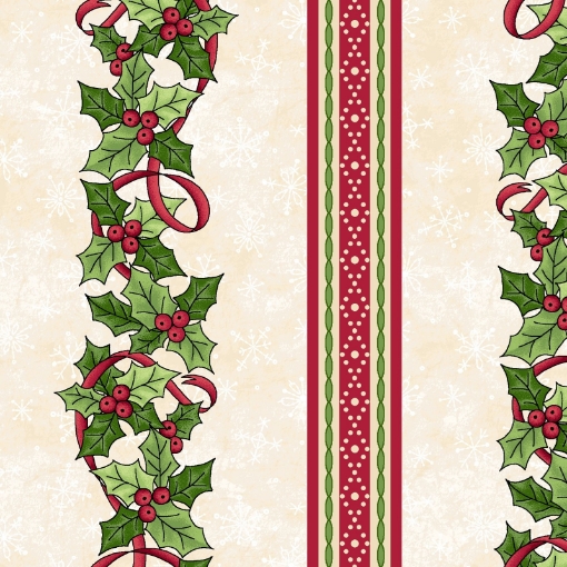 Full color Printed Stripes of Holly and a geometric print on a soft tonal creamy background that blends with our Feather Down and Cozy "Aged to Perfection" fabrics. This Holly Stripe will make beautiful borders and binding for Holiday quilted and embroidered designs!