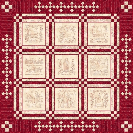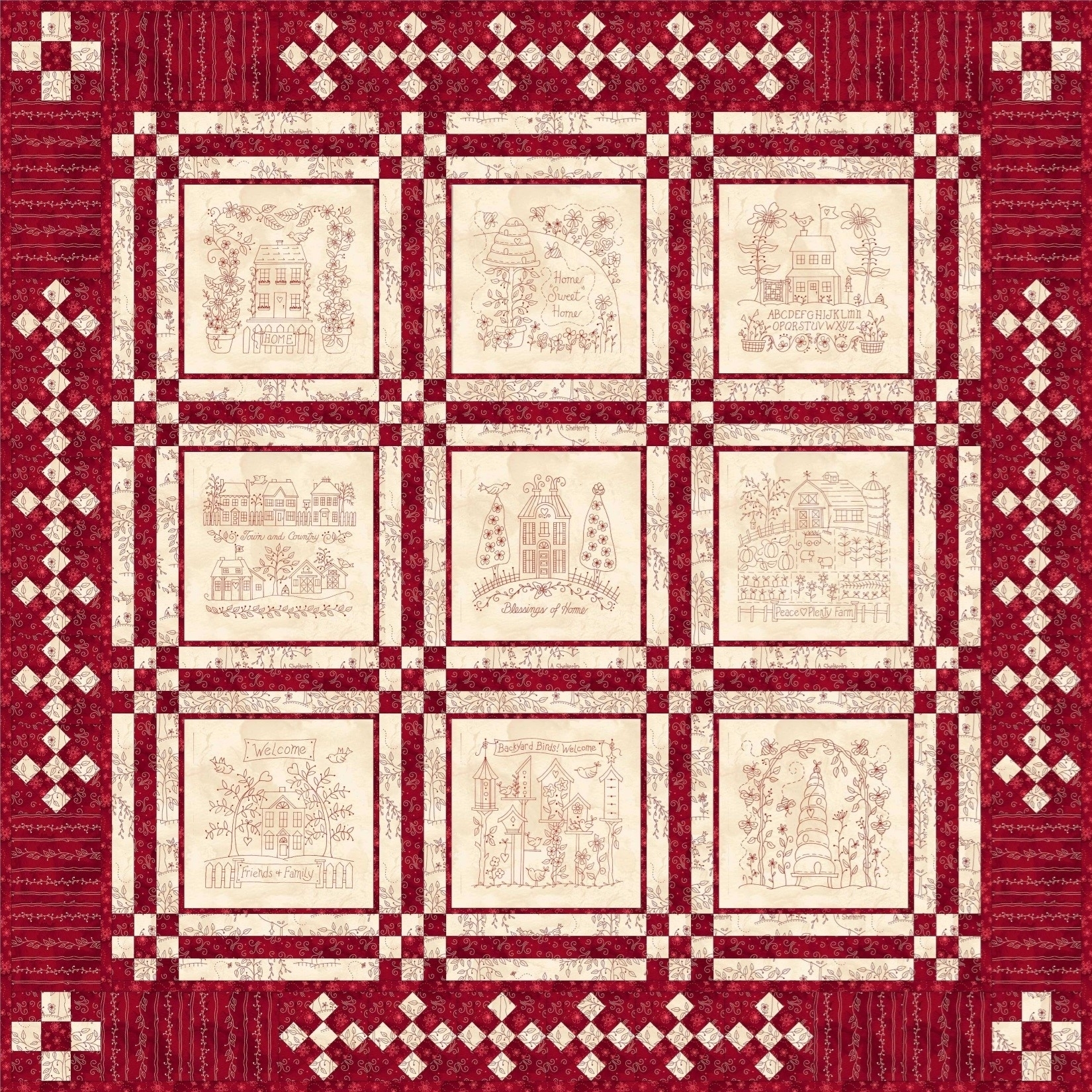 Nine Blocks Featuring Cozy and Heart Warming Views of 'Home Sweet Home'! Embroidered on Pashmina 'Aged to Perfection' cotton and finished with more Red and Cream fabrics for a Bold and Beautiful Quilt. Each of the Home Blocks will make a delightful pillow too....perfect for a House Warming Gift!