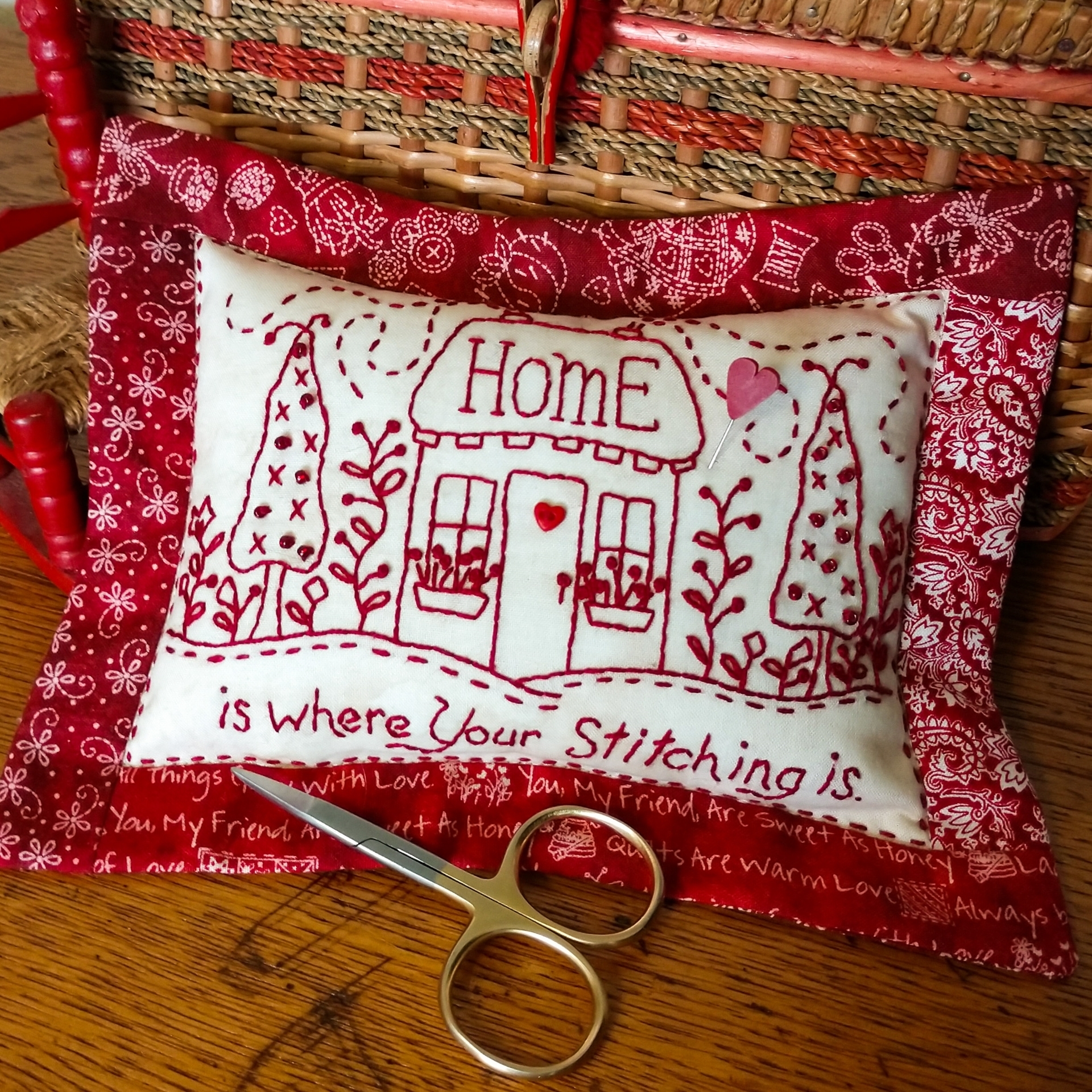 It’s true—Home is where your Stitching is! Embroider a RedWork Pin Cushion to tell ALL where you do your favorite thing. A cute little cottage with trees and flowers plus the happy verse.