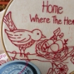 A little “red bird” inspects her nest filled to the brim with eggs, one sporting a tiny little red heart button. The sweet sentiment is one we can all appreciate – just like the little mother bird! A simple Embroidery in crisp RedWork shows off the spring nest tucked on a branch of blossoms and leaves. Enjoy this Table Topper or make a couple hangers with left over Red Dots and hang on a rustic tree branch from your garden.
