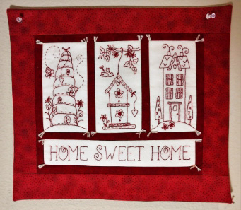 The RedWork Home Trio measures 12.5" x 14" with a stitched area of 3" x 6" for each Home.