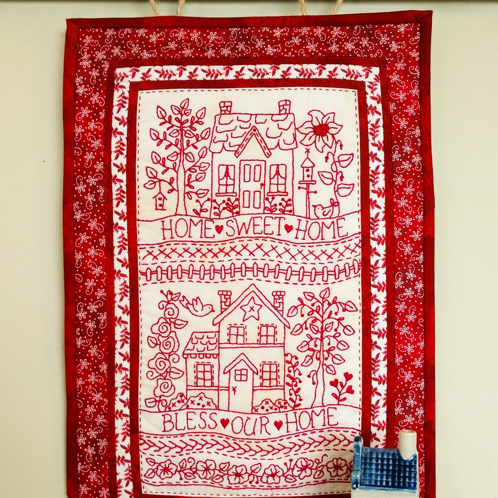 Celebrate your Home with a RedWork Sampler showing off 9 Embroidery Stitches stitching up 2 sweet Homes plus Trees and Flowers. A bright and cheerful RedWork to Bless and decorate your HOME