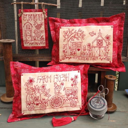 Size of the finished pattern: Small Hanging — 5” x 7”Pair of Farm Pillows – 10” x 13”Embroidery on Pillows – 6” x 8 ½” and 6” x 9”