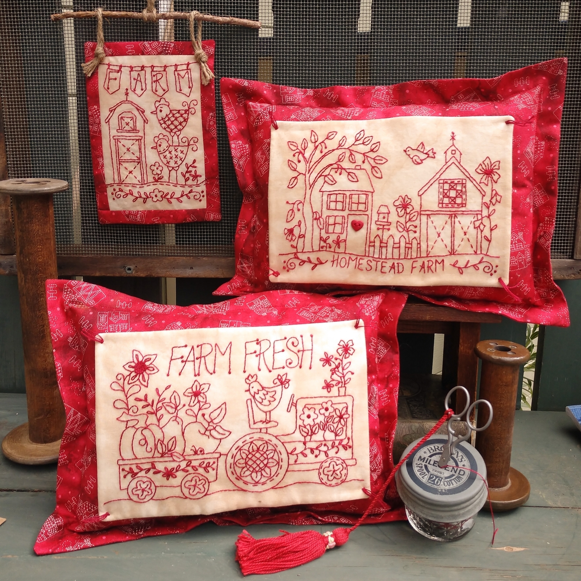 A fun look “Down on the Farm”! Embroider a pair of pillows plus a small wall hanging to decorate your home with country farmhouse style.