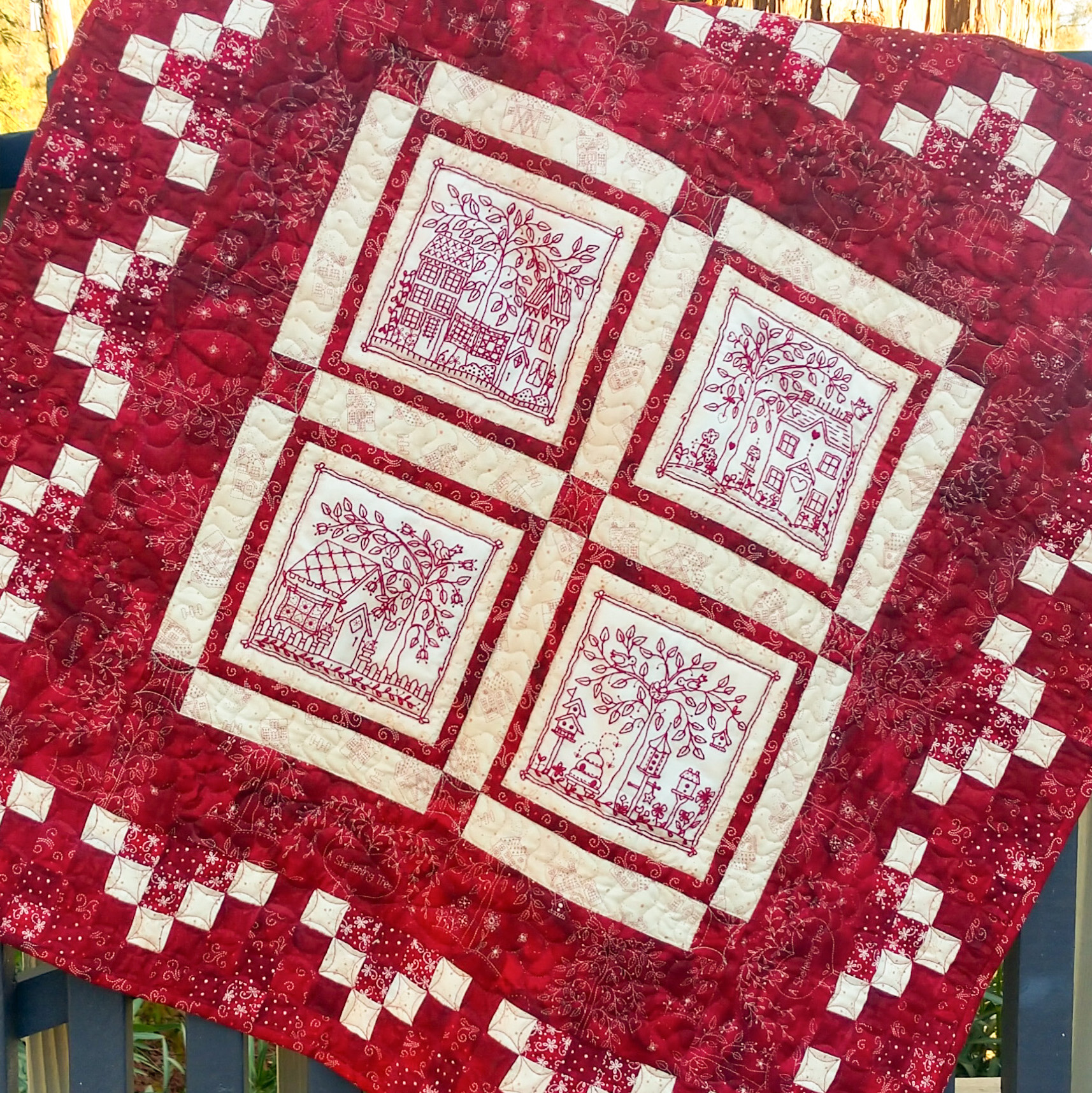 NO TRACING! Just stitch each of the 4 printed Panel Blocks.The Sheltering Tree Borders around the 4 Embroidered Blocks add interest and then finish your quilt with a “Trip Around the World” sashing creating a terrific Quilt to show off in your Home!! Each of the Sheltering Tree fabric styles complement the "Homey" flavor of this unique Quilt.
