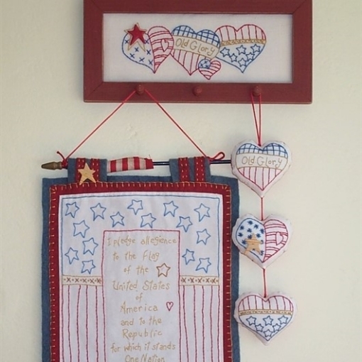Applique your finished Pledge of Allegiance on Red and Blue wool and hang from a rolled up flag. A perfect teacher's gift!