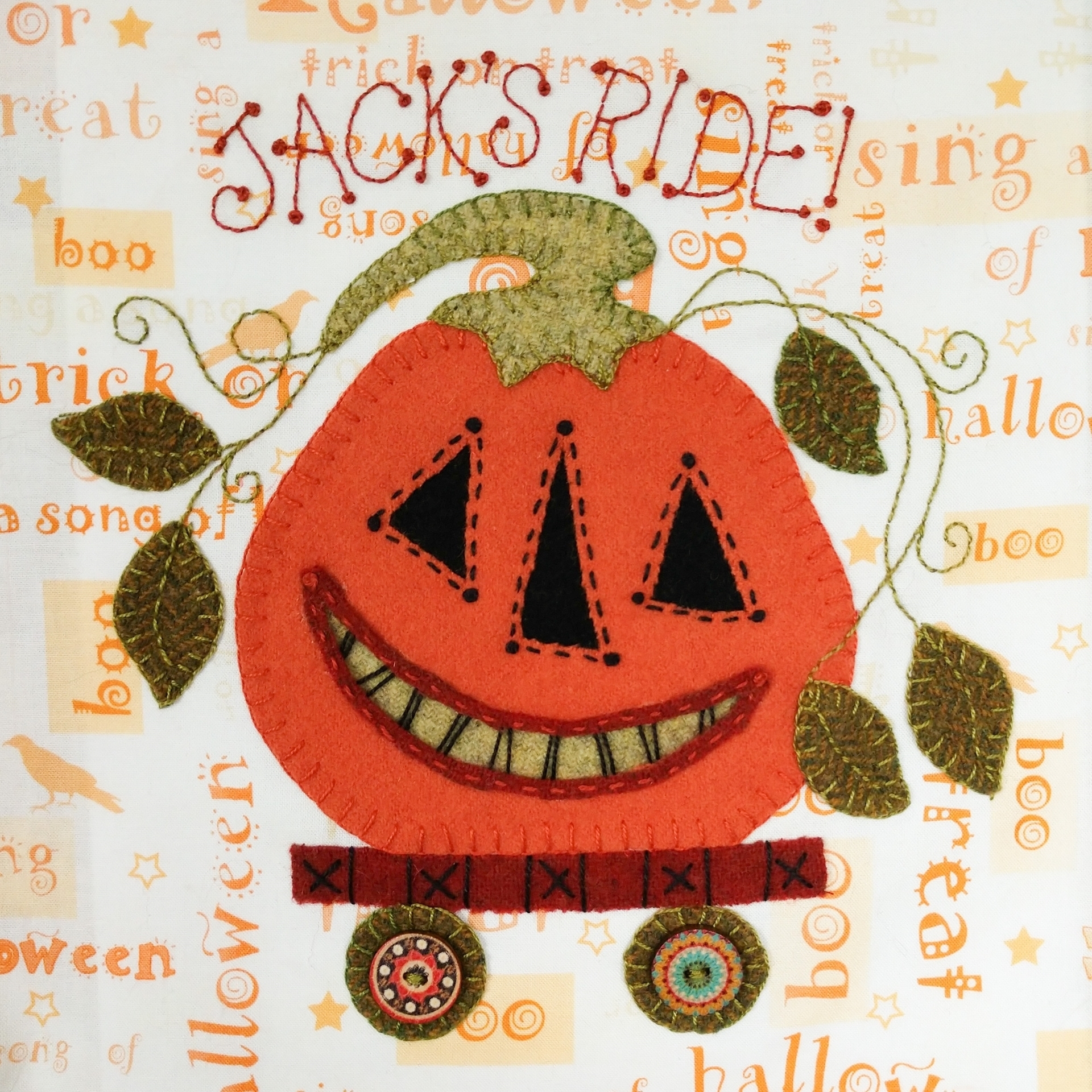 Jack is Wool Appliqued on a cotton Halloween print fabric. Jack’s face is created with Reverse Applique cutting away the topOrange wool layer to reveal other Wool underneath….FUN! Wild pumpkin vines and leaves swirl around Jack as he zooms along.