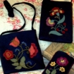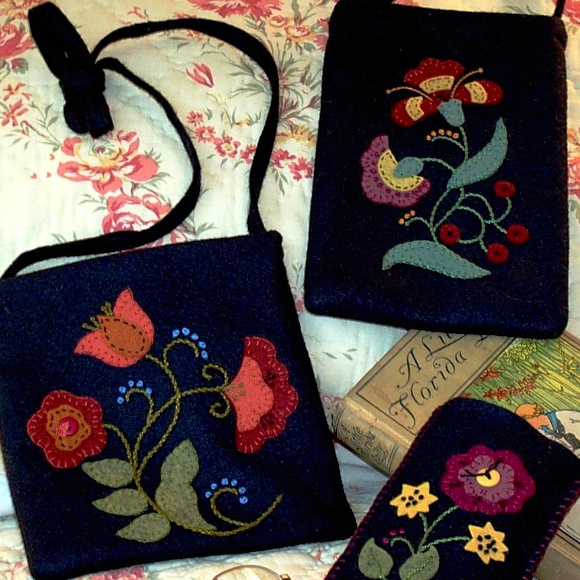 Three designs to create in Wool Applique. The square design is perfect to tuck in a wallet and keys for a day out. The long bag can tote your phone, camera or use as a purse too. The eyeglass case is just the right size to put in your purse or add a strap and keep your glasses handy! Easy appliqué and stitchery to add interest. A fun trio!