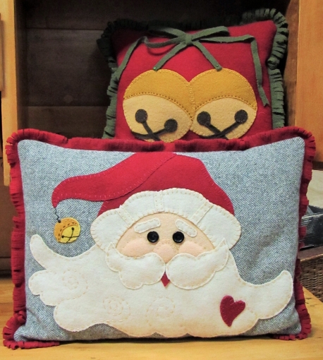 Jolly 'ole Santa has Chubby Cheeks and a Plump Nose Plus a Bright Jingle Bell Dangling From His Hat. Make the cheerful Jingle Bell pillow to accompany Santa - wonderful Wool Applique accents to brighten your holiday decorating.The Wool Applique pillow kit has an elegant gray herringbone background for Santa and rich hand-dyed dark red for the jingle bell pillow. The clever fringed wool pillow trim looks great and is so easy to do. DMC #8 Perle Cotton used: 580 Olive, 738 Beige, 783 Gold, 938 Brown and Presencia 0007 Black, 1915 Robin Red.Handy Hint - Thread each of your Perle cotton colors in its own crewel embroidery needle to speed up your applique.Finished Sizes: Santa Pillow 12" x 16", Jingle Bells Pillow 9" x 11"