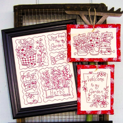 Garden ALL yearlong with your "Indoor Garden" and enjoy a perfect place in pretty RedWork embroidery. Make a pair of framed designs plus a pair of Mini Signs to hang on the door to the garden. Fun pots filled with plants and flowers to cheer your indoor days.