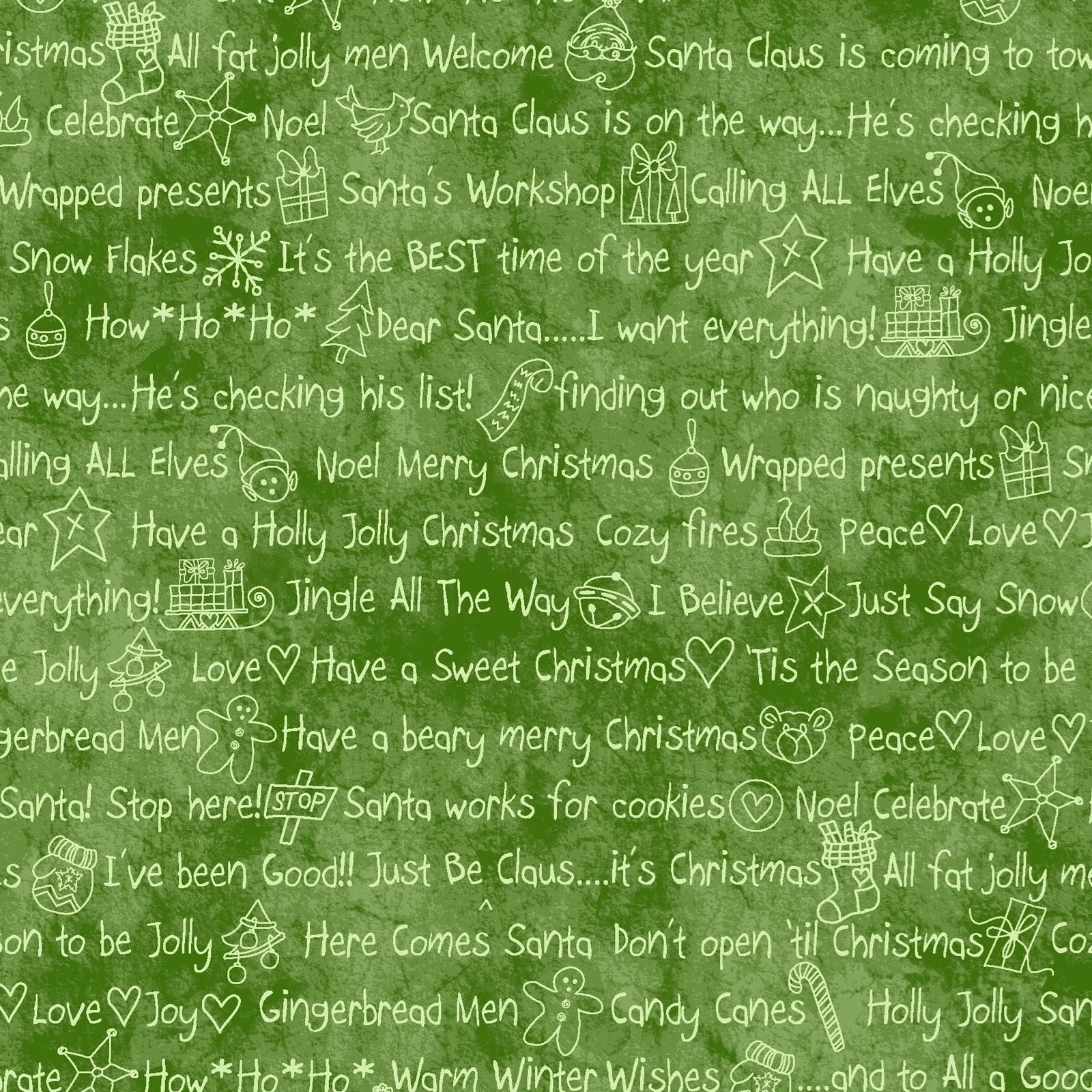 Printed "Words" fabric is so FUN to add to Holiday designs and projects in Embroidery and Quilting. Happy, jolly words and saying of Christmas and Winter printed in Natural on Green Background! This colorful Cotton is perfect for Holiday quilted and embroidered designs!