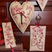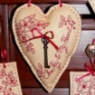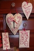 Four thoughtful embroidered Valentines for February 14th and Everyday, too! Make a fun stuffed heart embroidered on our Tea-Dyed "Aged to Perfection" Cotton. Create another little hanging to celebrate "Me and Thee" or maybe "Hugs and Kisses"...all look great with the added sparkle of red glass beads. "Remember Me" and pretty floral Book Mark make great gifts. The little vintage-look brass key is an extra sweet final addition to your heart. We have them for you in case you don't have an antique key.