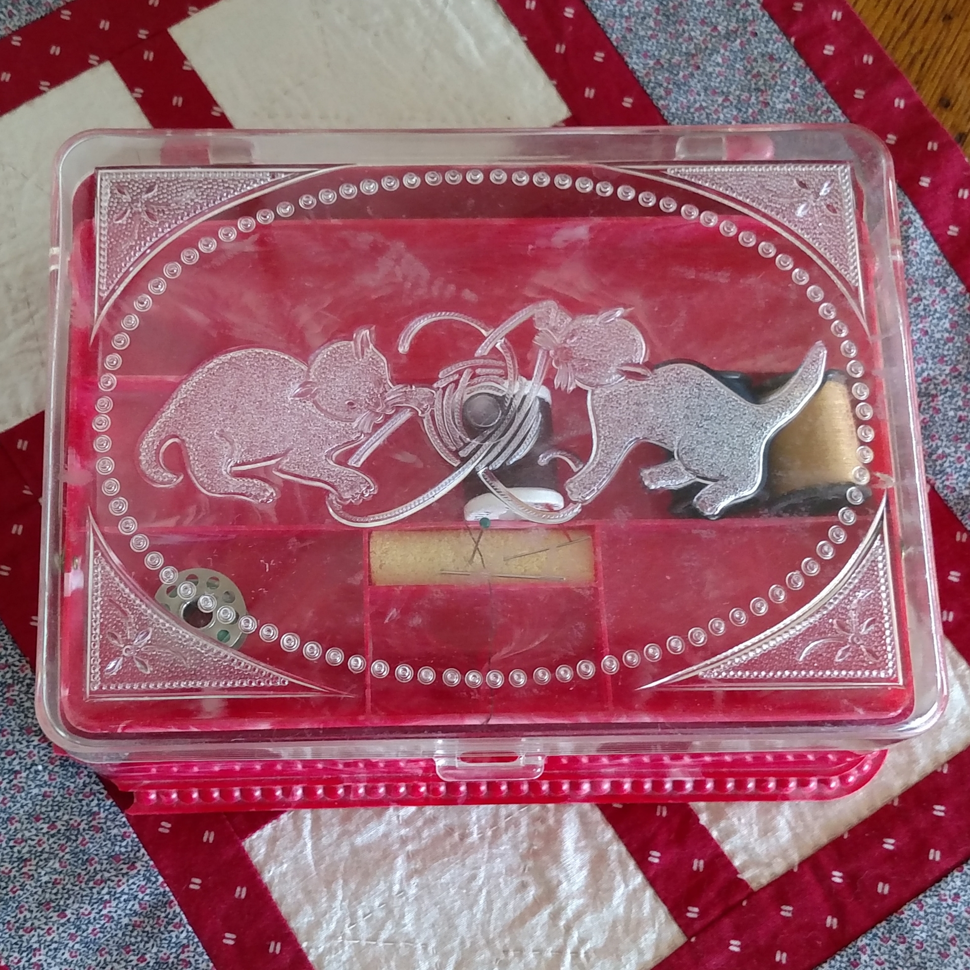 This fun little tiered Sewing Box has a real retro flair! The little tray inside lifts automatically when you open the box. A cute pair of Kittens play with a ball of yard on the top. Plenty of room for lots of sewing goodies.....what a nice gift for a "little sewer" in your home!