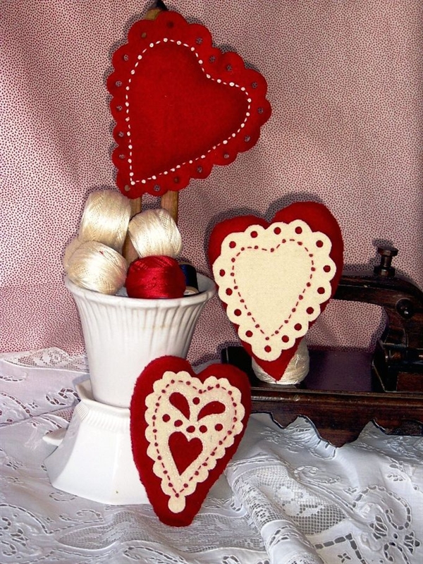 Three "everyday" Valentine hearts are quick and easy to make in 100% wool applique. Create lace tops for 2 of the pin cushions and a cute scalloped edge on another rich red heart. Use a very fancy "needlework tool" to make the eye-lets - a paper punch! Perfect little gifts for all your friends and family.Add some lavender buds to your hearts for something sweet and special. Stuff with wool fleece for an even better use with your pins and needles!Our complete kit includes all the felted wool needed to create your 3 hearts PLUS needle, #8 Perle Cotton and pattern. All you need is the fleece stuffing and lavender to complete!4" x 6" to 5.5" x 6" hearts