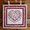 Delicate RedWork Flowers and Vines surround a pair of “love birds”. A lovely embroidered design for a sweet Valentine’s Day. Your heart will make a perfect Gift for someone Special to remember on Valentine’s Day! An easy and effective finish of concentric rows of various Red & Cream cottons to frame your pretty heart.