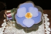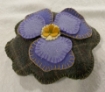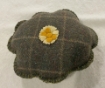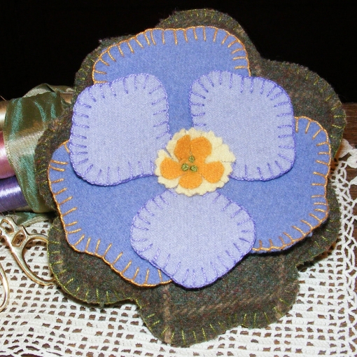 Pretty Lavender shades of wool petals stitched with #8 Perle cotton Blanket Stitch around the edges. The center is layered with Yellow and Gold wool! The large window pane checked olive green wool background is hand stitched around the edge with Blanket Stitch. This handy pin cushion is filled with 100% wool fleece. This will make a useful pin cushion accessory for your sewing room or a lovely gift for a stitching friend!6" x 6"