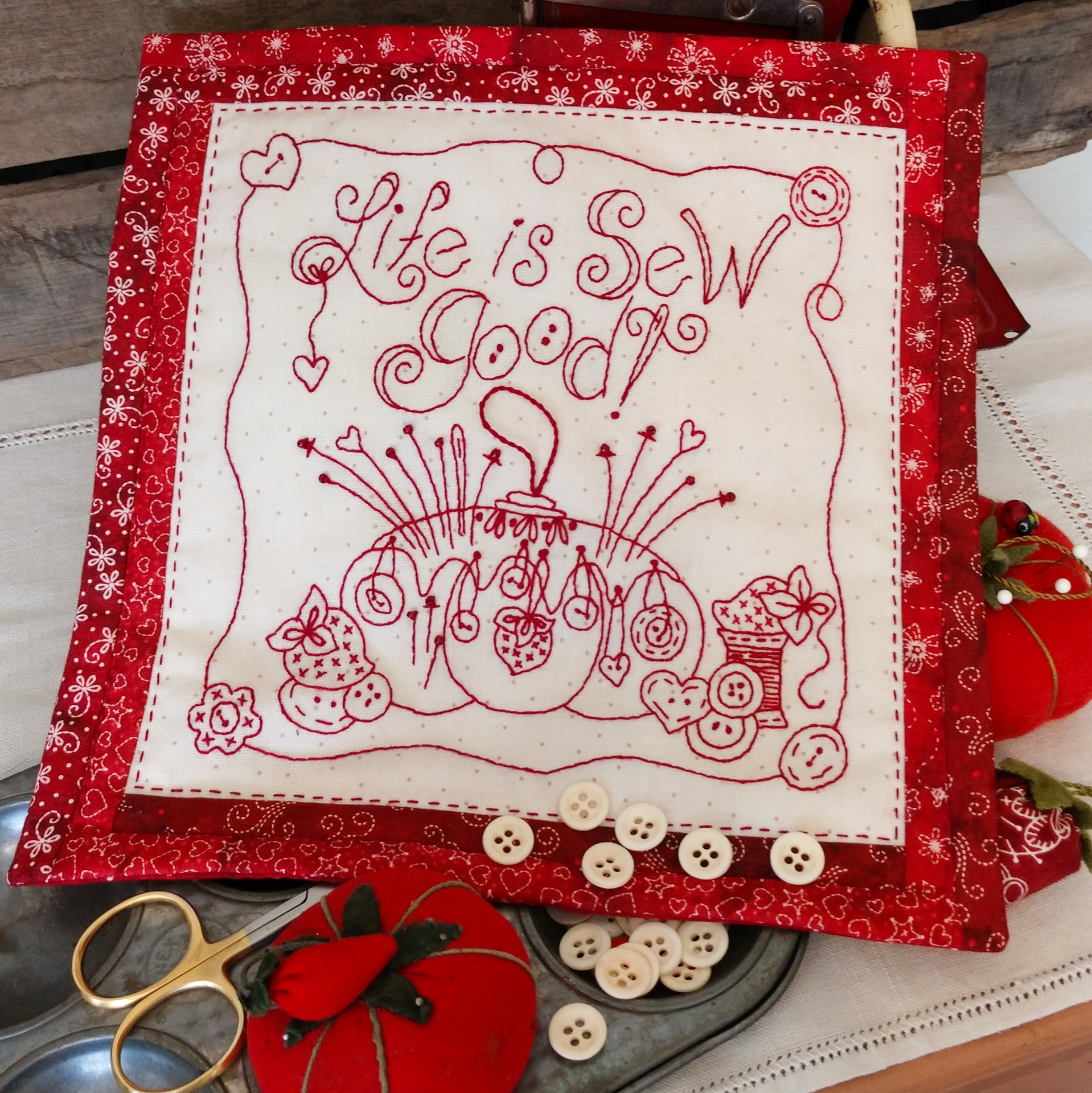 A favorite Motto for those of us who LOVE our Embroidery….Stitching does make Life Good!! A nice fat Tomato Pin Cushion with other “Stitching Necessities” make this Stitcher’s RedWork a design to enjoy wherever you Embroider at home. A fanciful Pin Cushion in crisp RedWork is embellished Glass Head Pins plus many Buttons and a Strawberry Emery hanging along the sides. Make Monk’s Cording to come out of the 2 Buttons finishing the top of your Cushion. Happy Stitching!