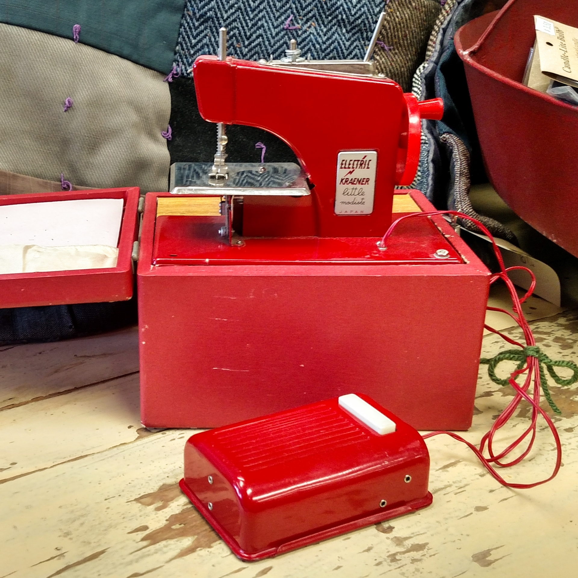 Cute bright "Little Modiste" red toy sewing machine....perfect to decorate with! Add a whimsical note to your sewing room and start a conversation. This cutie has a lovely case for carrying and display! This is a battery operated machine. Made in Japan by Kraener.