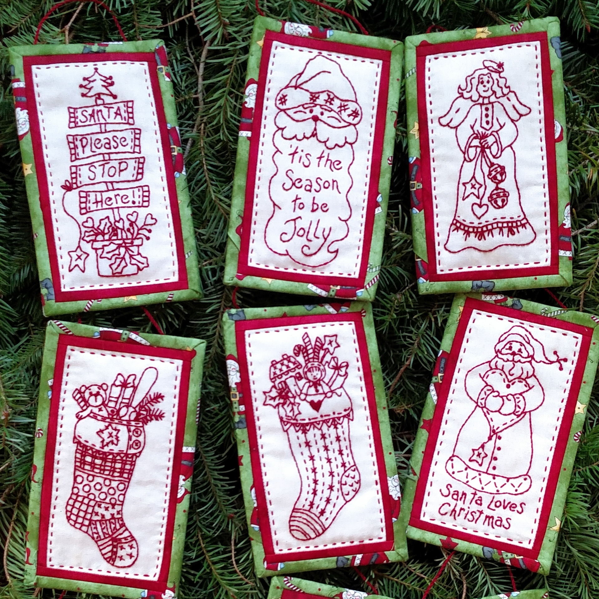 9 Long and Tall Ornaments that will look great on your Christmas Tree or tied to a Special Gift for a Special person on your Holiday list! These slim and trim Ornaments will, also, be great hanging from a string as pennants for the holidays. As you enjoy the RedWork Embroidery and Easy-to-Do finishing, think of all the FUN ways you can decorate with these Ornaments!