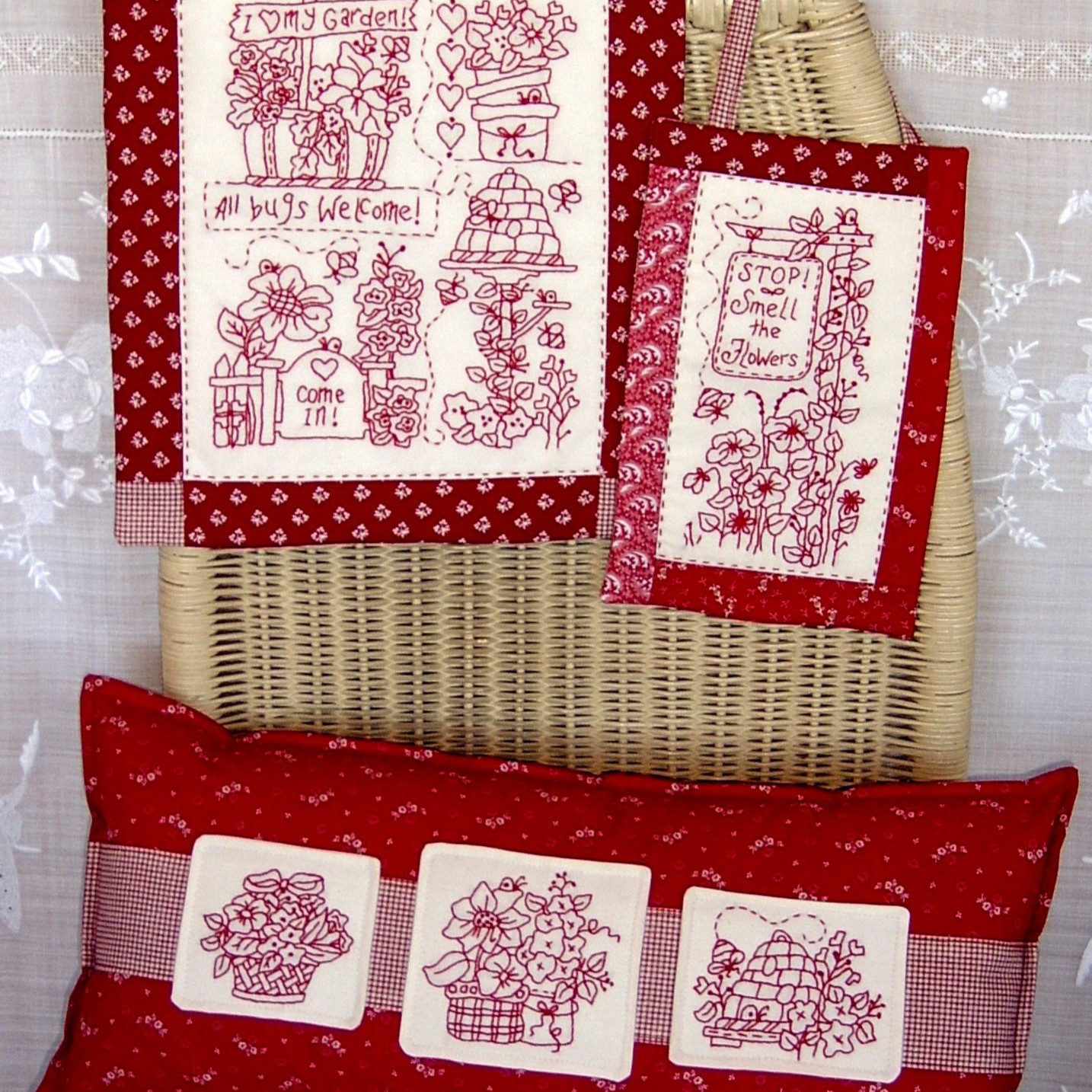 Three perfect decorative accents for the dedicated gardener. A fun way to bring your garden indoors with crisp red & white floral designs. Lovely on the sun porch! Make a gift for your favorite gardener and enjoy the embroidery time.