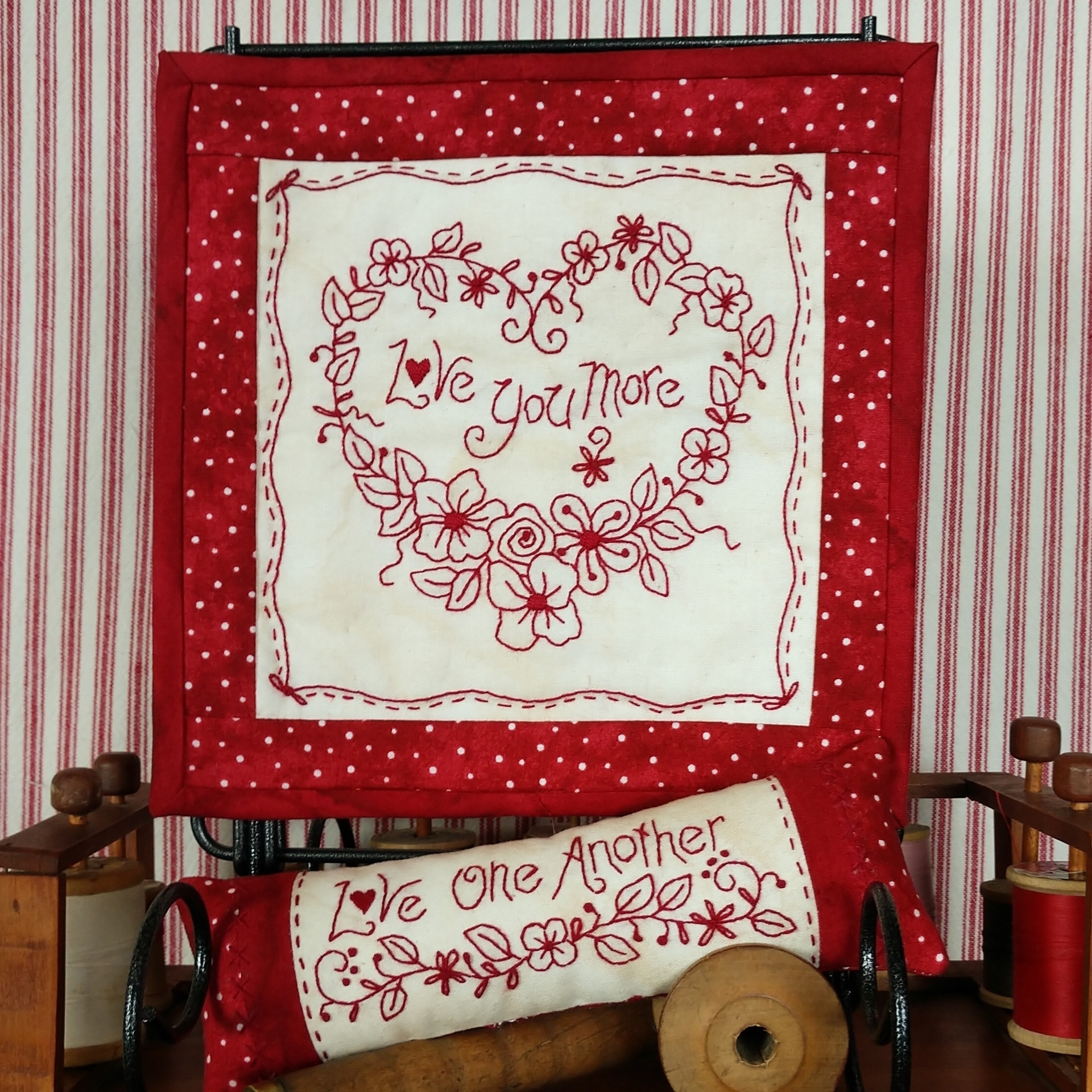 A delicate wreath of simple blossoms stitched on a rich tonal shade of cotton to enhance the RedWork. A curved border plus “Quick Quilting” finishes your sweet design and will be a lovely sentiment to please someone special to you! The petite Sachet-Pin Cushion filled with Lavender Buds makes a Quick-to-Stitch Gift for your stitching Friends and Family.