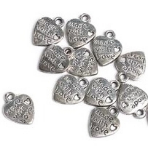 Enjoy making your decorating, entertaining, gifting, wearing, and crafting particularly special with these "Made with Love" Metal Heart Charms! Shiny, small symmetrical hearts with top connected eyelets are engraved with wee hearts and the phrase, "Made with Love."