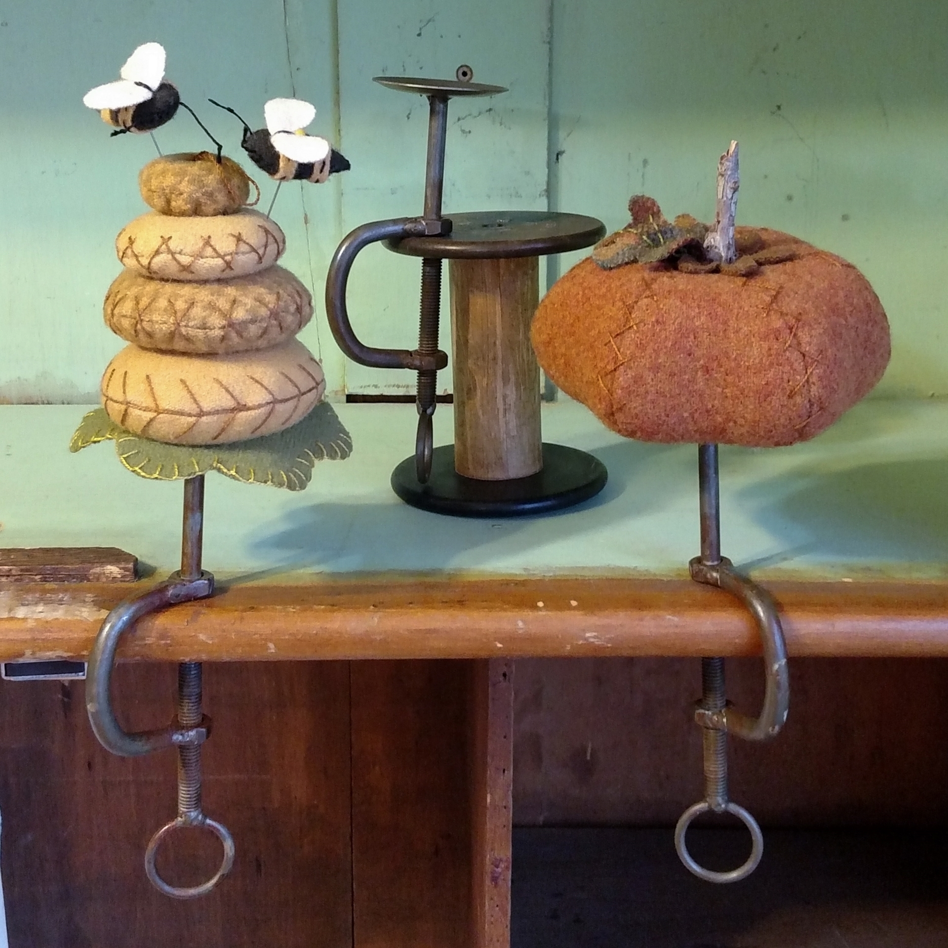 A Vintage-Style Metal Clamp you can use as a great make-do base. Glue or stitch your make-do design on the slightly curved 2" circular top of the metal clamp. Screw the metal clamp to any table, shelf or whatever! Have some fun creating your own pin cushion make-do designs!