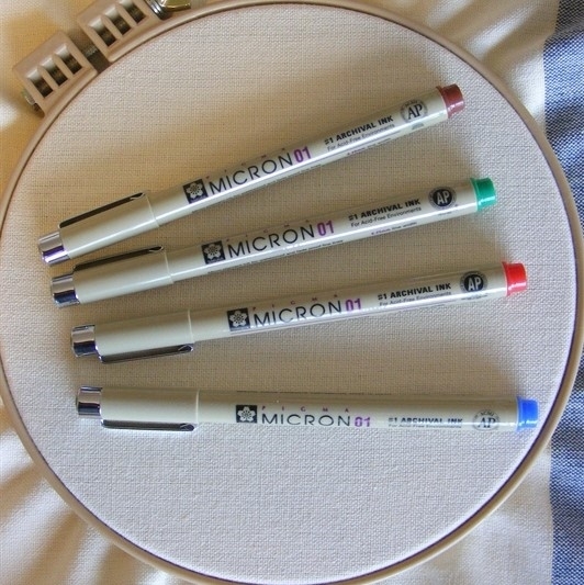 Permanent in pens with a very thin tip to trace designs directly onto fabric. The ink is permanent and will NOT bleed when you launder your embroidery after the stitching is completed.Your #8 Perle cotton embroidery will completely cover the lines. Four colors to select to complement the Perle cotton colors used for your embroidery designs.Just tape your pattern on a light box (or tape in a bright window) and then tape your fabric over the top to secure. With your pigma marker, draw the design directly onto the fabric. The pen will flow easily over your fabric, no need to press really hard.