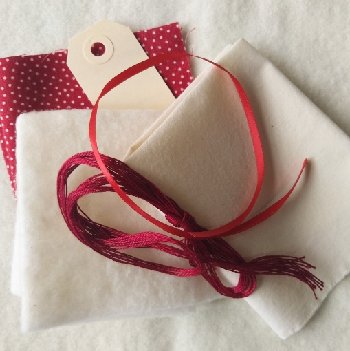 Complete Kit includes muslin for embroidery, red & white fabric backing, Red Robin perle cotton, needle, thin quilt batting, 1/8" satin ribbon and gift tag.