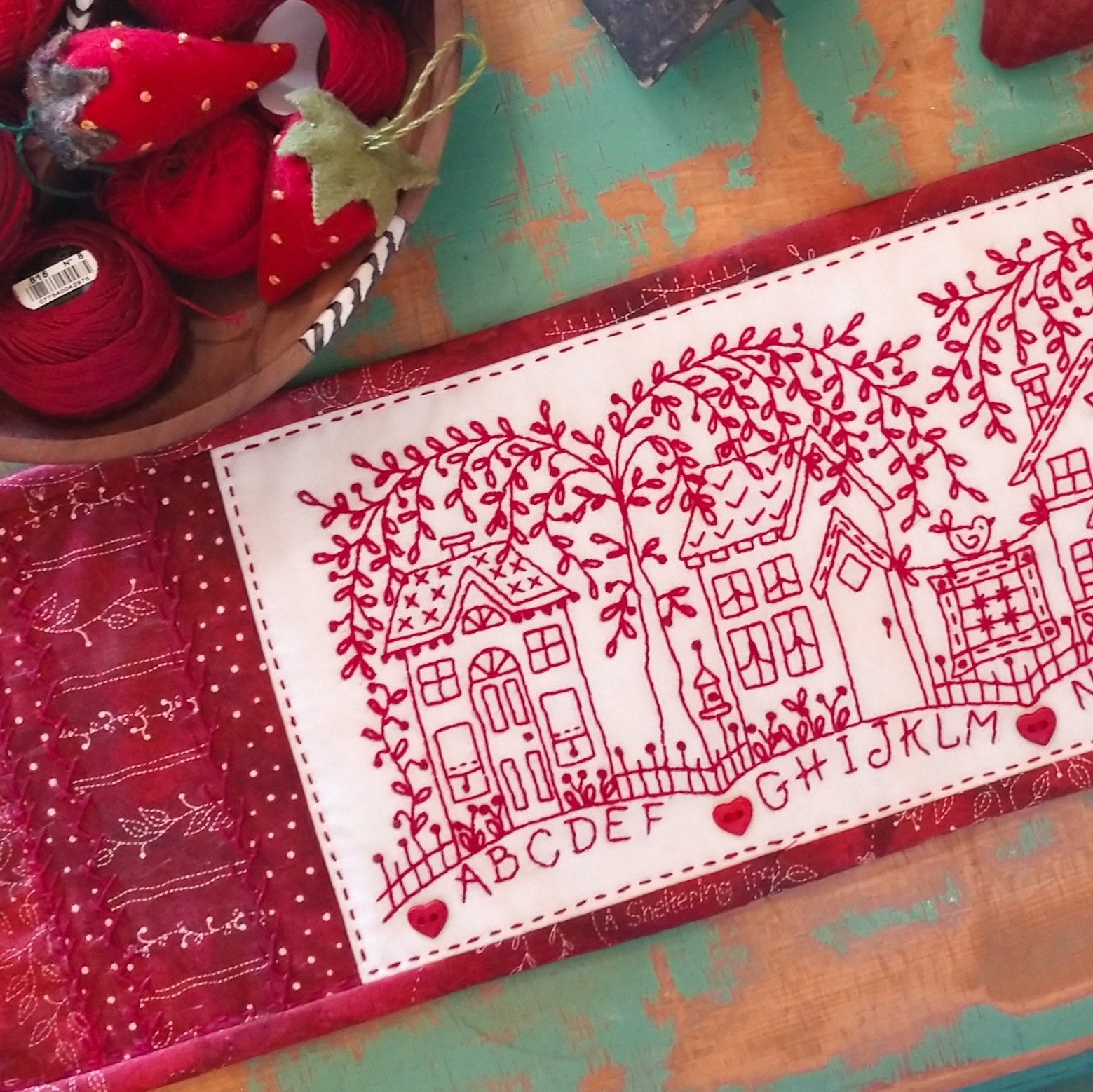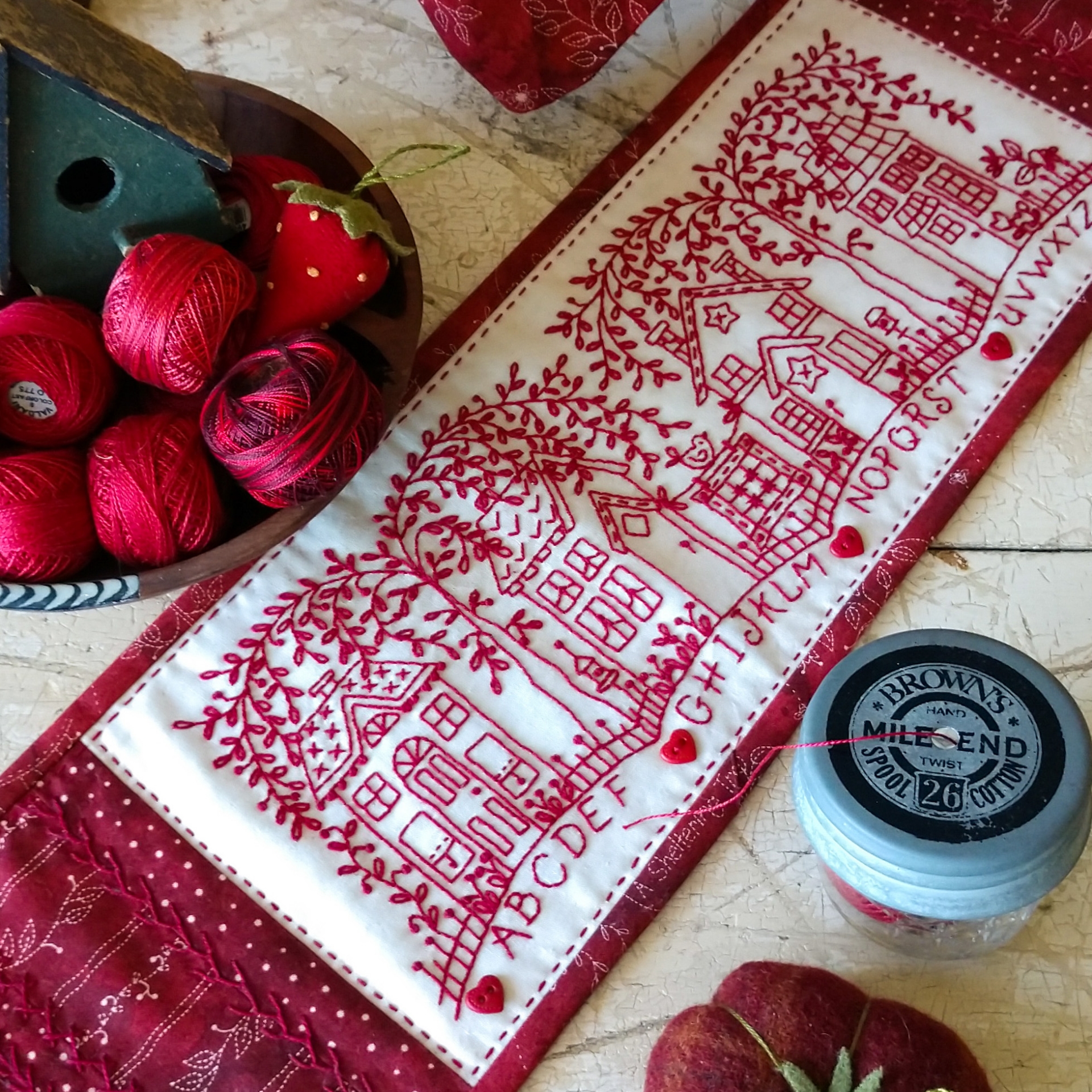 The alphabet underlining the houses adds a Sampler-style flavor to your RedWork Table Runner.