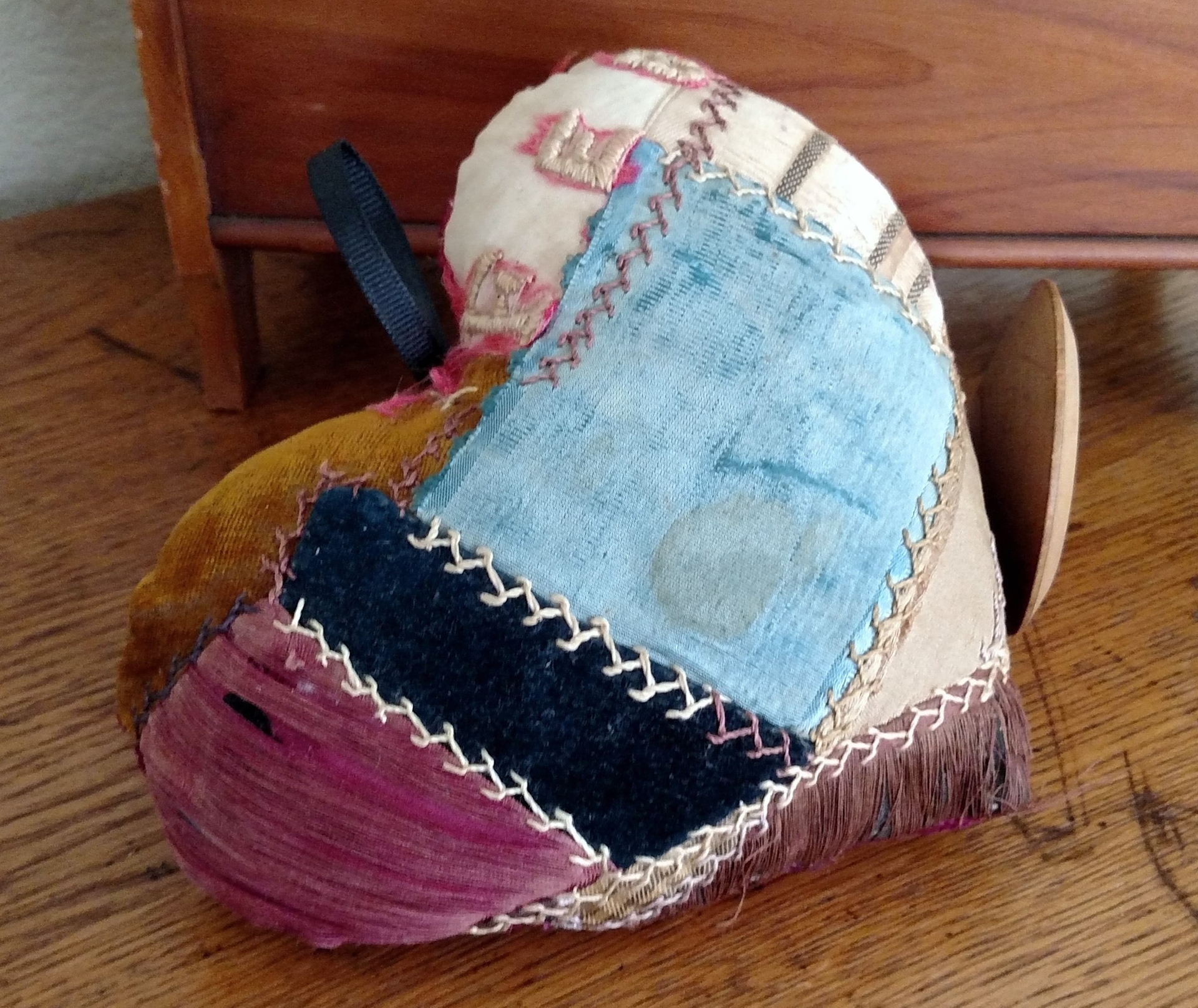 A much loved and used Victorian-style Crazy Quilted Heart shaped Pin Cushion made created with a varity of silks, velvets and ribbon. Initials "FEB" are embroidered in the heart. All fabrics are warn with age but it is still a lovely little example of Crazy Quilting with plenty of Feather stitching added! A hanging loop can make it a sweet decoration. The back is a burgundy cotton corduroy. Choose this one of a kind pin cushion for yourself or use as wonderful "last minute" gift!! 5 1/2" tall x 7" wide