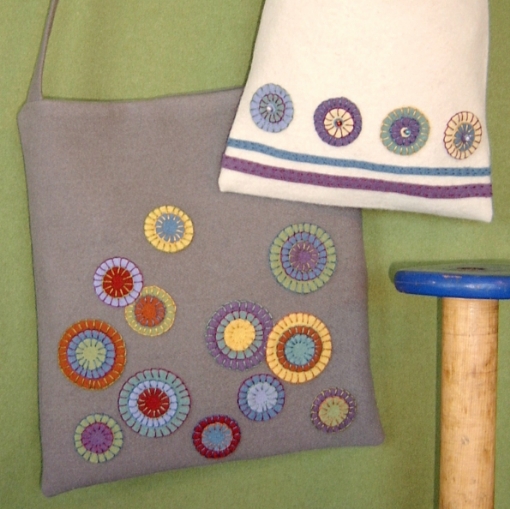Two traditional "Penny Rug" Wool Applique style designs that make great accent purses to add to your wardrobe. The "pennies" are fun to make and add a contemporary look to the purses - all made with 100% felted wool applique.