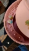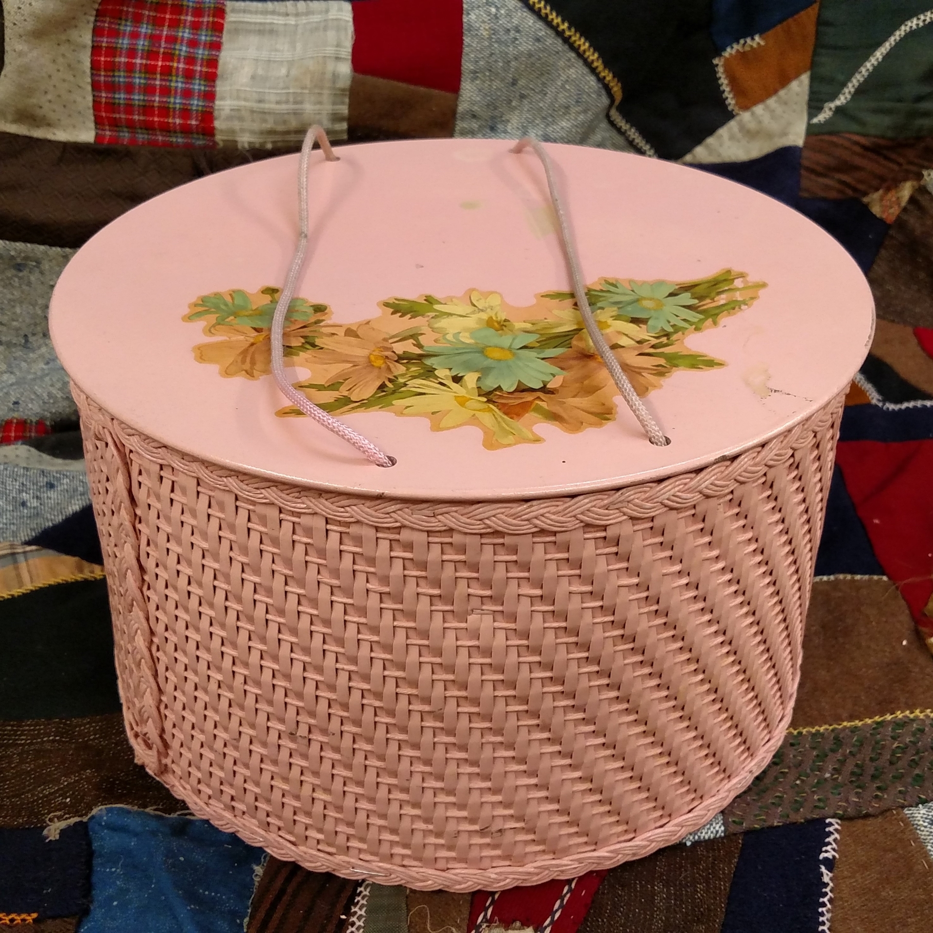 Charming vintage pink wicker sewing basket made by Princess in Algonquin, Ill. It likely dates to the 1940s or 50s. Lid, which is decorated with a floral decal, is attached to basket with woven cording that forms a handle. Inside the basket there is a holder for spools of thread.Basket is in good condition. Basket portion is strong and solid. No holes or rips. There is some wear both inside and outside but nothing that wouldn't come with age. Cord has been shorten and you may want to replace.