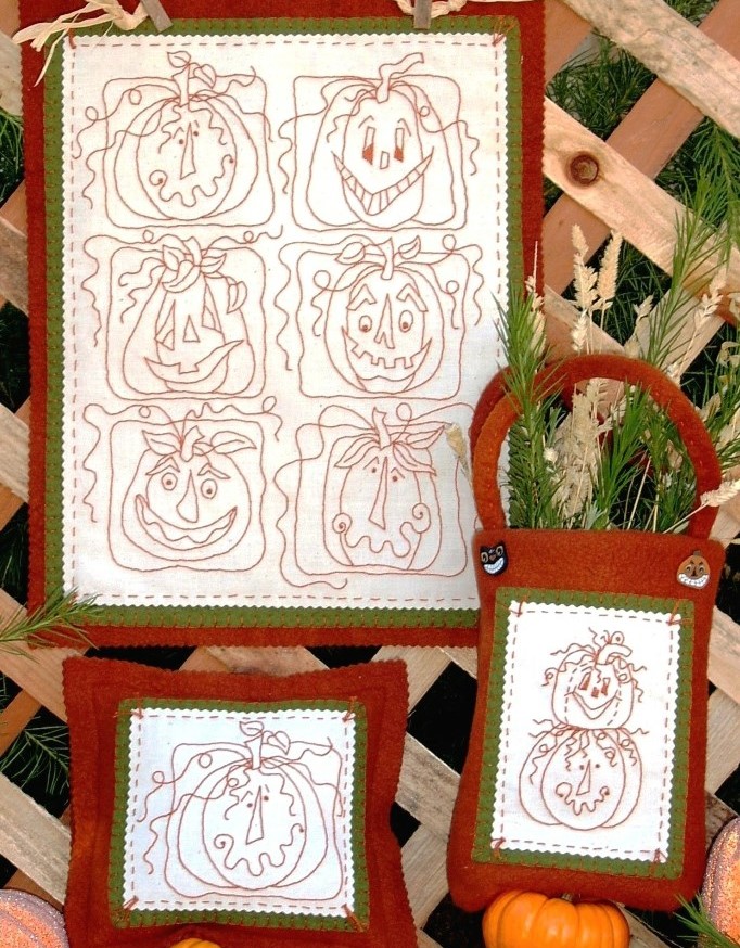 A whole patch of whimsical pumpkins perfect for decorating during the autumn season... perfect for Halloween! Create a wall hanging to greet guests or add pumpkin's faces to a cute little treat bag. Stitch up a bunch of mini pillow to fill a basket or use as pin cushions!