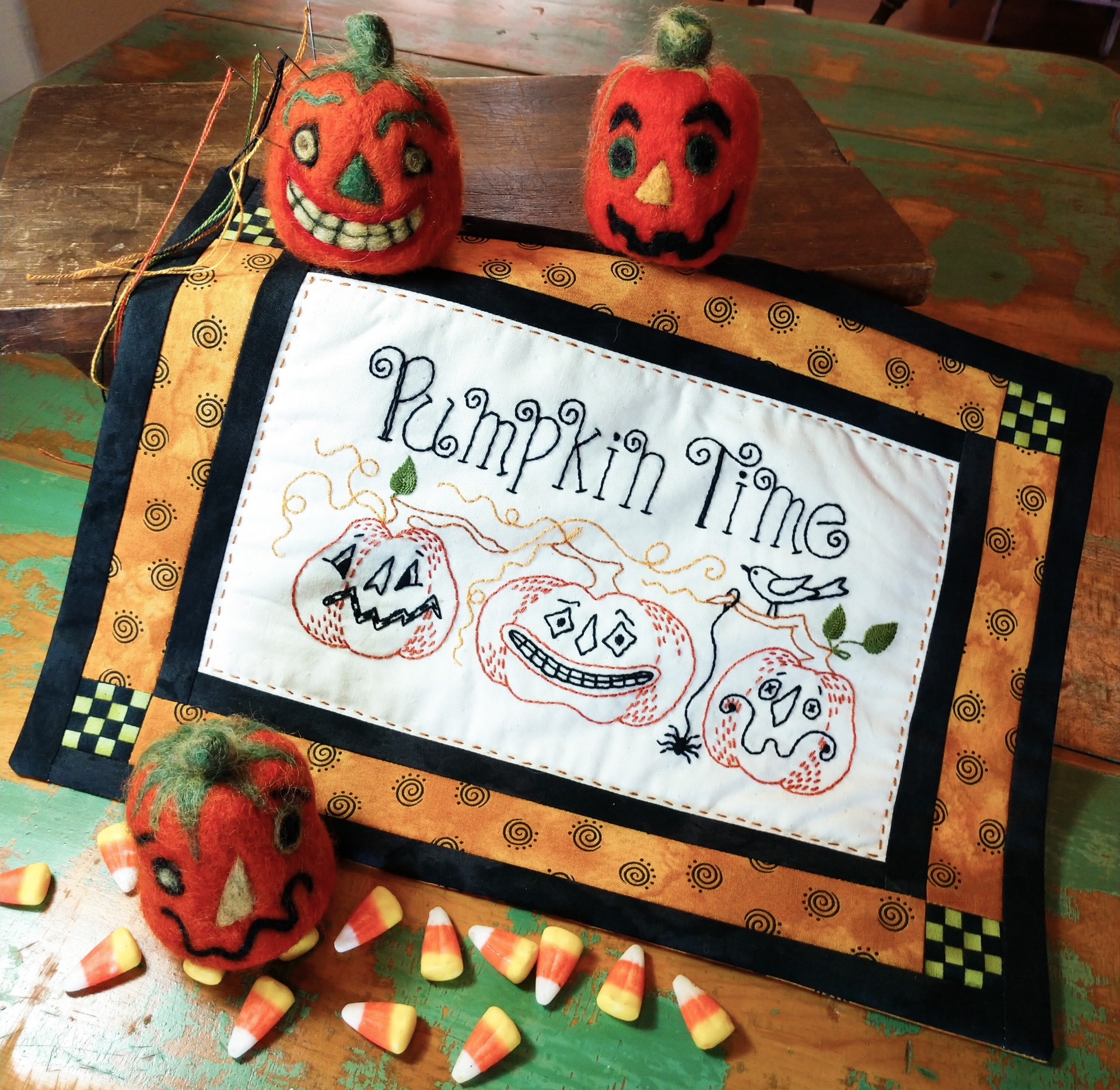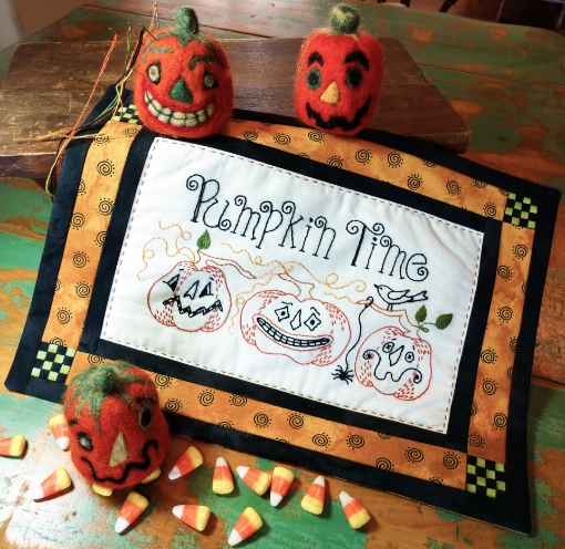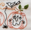 Stitch a row of happy Pumpkins for a Halloween Trick or Treat! Lots of contrast with Halloween Perle Cotton colors on creamy Muslin make a great Halloween Embroidery. A funny Row of Pumpkin faces to add to your Halloween decorating.