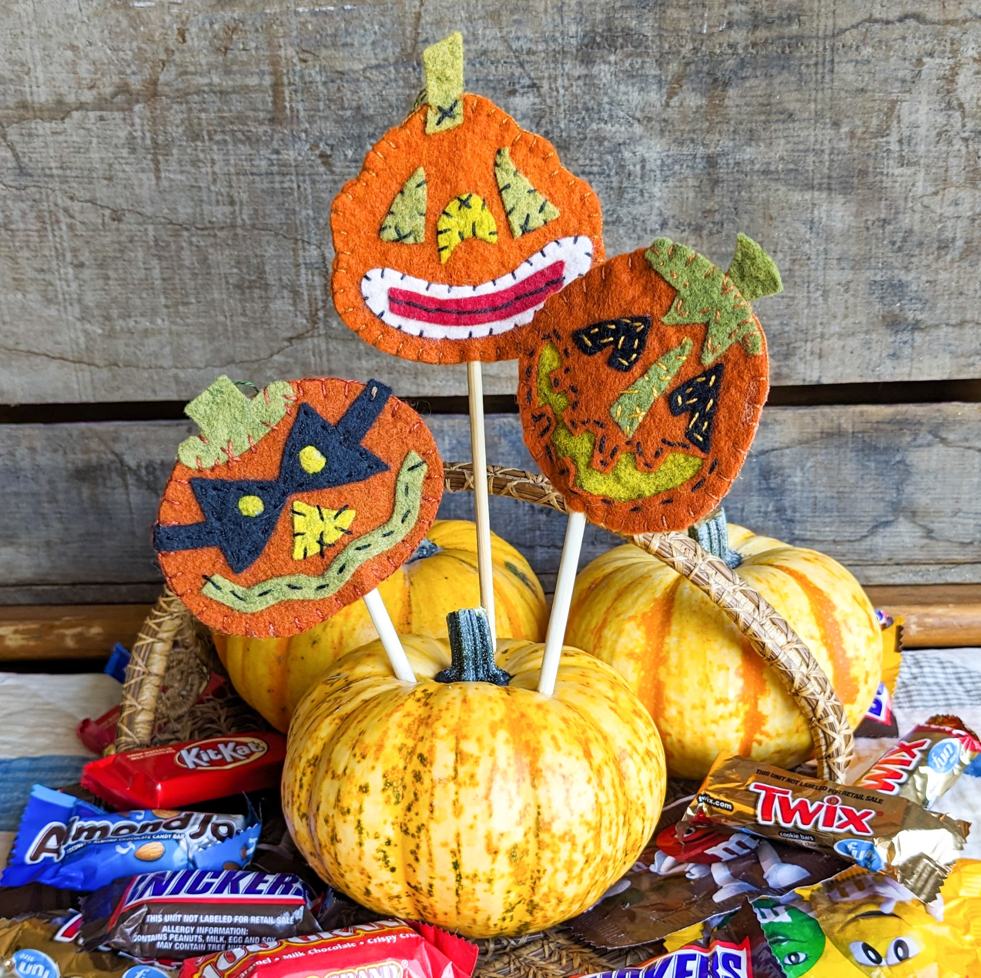 More Halloween/Harvest pins. Three funny pumpkins - each with his own special personality! Make Ralph, Burton and Monte to wear ALL fall. How about hanging this trio on a "harvest tree" created with a tree branch.Just print or trace each part of the designs on Freezer Paper, cut out and iron (shiny side down) on your wool. Print additional copies on Freezer Paper as you need them to cut out!