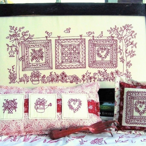 Three pretty quilts displayed on a Clothesline for you to admire in a Peaceful Garden - wouldn't it be fun to sit and embroider there? Frame your Quilts in the Garden or make it into an interesting long pillow finished with red and white fabrics. Use some of the design motifs and create other finished goodies for your home decorating.