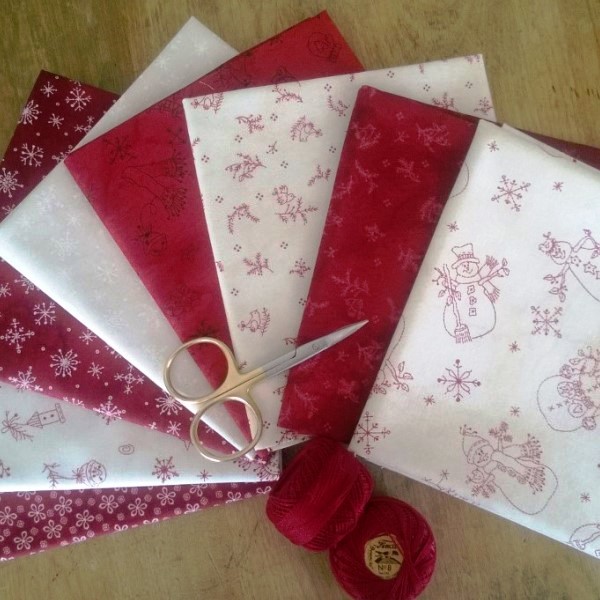 All eight of the cheerful Red Collection of cotton fabrics from the Bird Brain Designs Snow Happens Collection. Includes the White on Cream Snowflakes to use with ALL the Reds. Perfect to Create Christmas and Winter Embroidery and Quilting Projects,